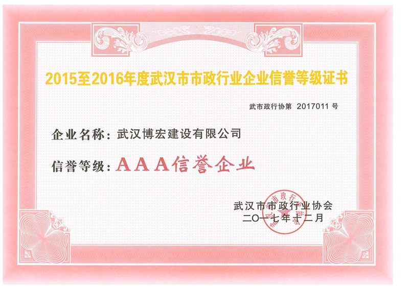 2015-2016市市政行業(yè)AAA信用等級(jí)證書