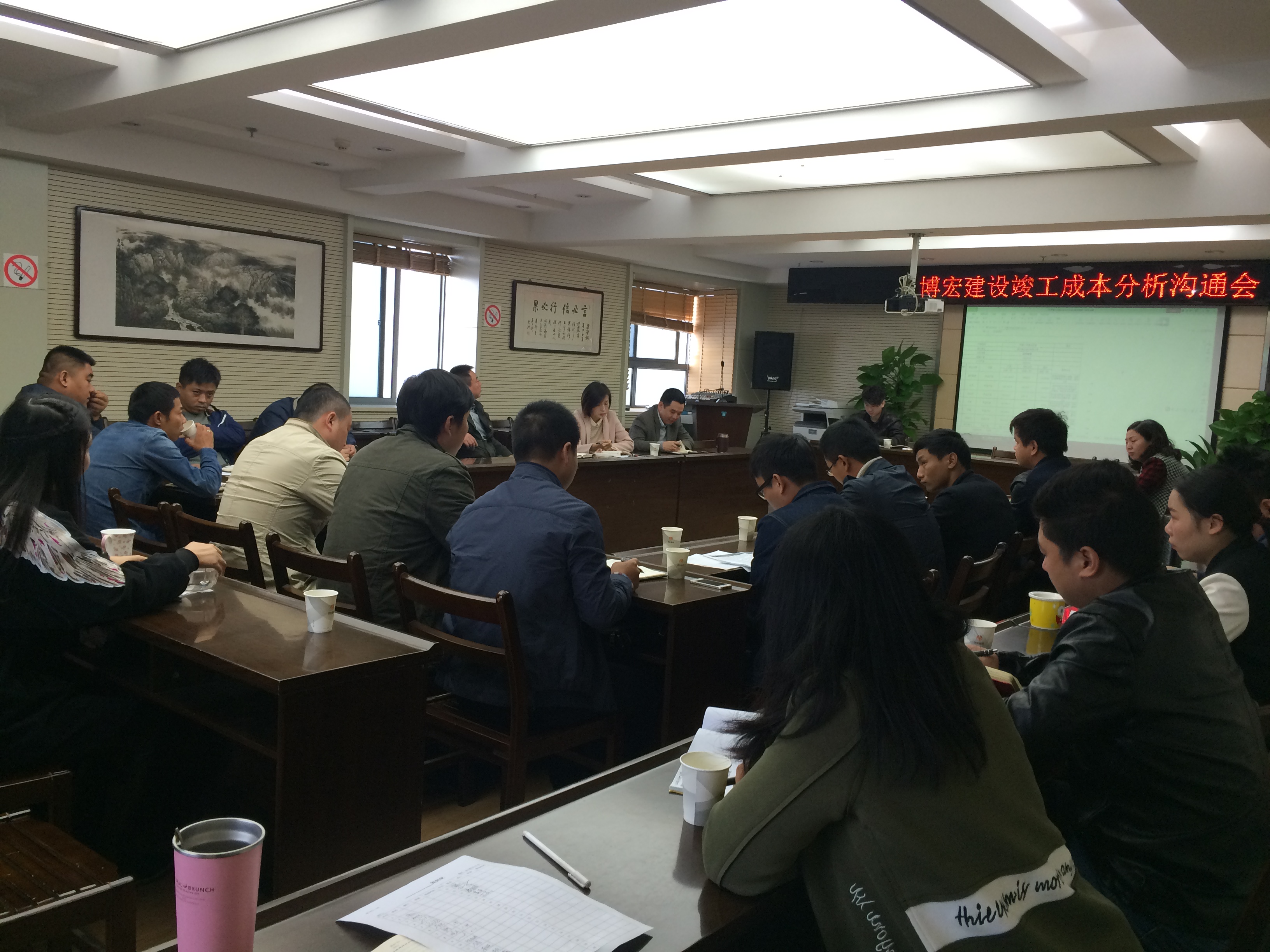 為了進(jìn)一步促進(jìn)成本、合同、結(jié)算管理工作,博宏公司造價部于2016年10月27日上午9點(diǎn)在公司會議室召開悅城、芳草小學(xué)等7個項(xiàng)目的成本分析會,總經(jīng)理、支部書記、全體項(xiàng)目經(jīng)理、預(yù)算員以及造價部全體人員參加了本次會議。