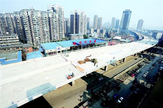 昨日,記者來(lái)到雄楚大街改造工程指揮部發(fā)現(xiàn),這里異常繁忙,工人們都在忙著搭腳手架、趕進(jìn)度。記者看到,雄楚大街高架梅家山立交至武漢理工大學(xué)段橋面已全線貫通,整條高架已成形。對(duì)接二環(huán)線珞獅南路高架的接線,正在緊張施工中。施工方介紹,昨日貫通的一段將于今年五一通車(chē)。據(jù)了解,二環(huán)線漢陽(yáng)方面,只剩下龍陽(yáng)大道墨水湖北路至知音橋段仍在施工中,其他路段均已通車(chē)。