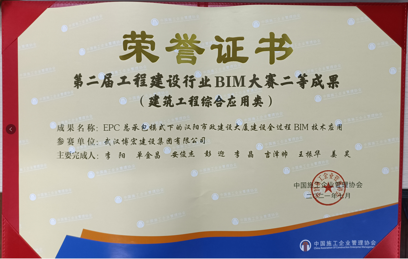 10月8日,博宏建設捧回“第二屆”全國工程行業(yè)BIM大賽獎杯,此次BIM大賽為全國性性質(zhì)比賽,由中國施工企業(yè)管理協(xié)會主辦,公司參賽作品“EPC總承包模式下的漢陽市政建設大廈建設全過程BIM技術應用”在2275個作品中脫穎,獲得二等獎的優(yōu)異成績。