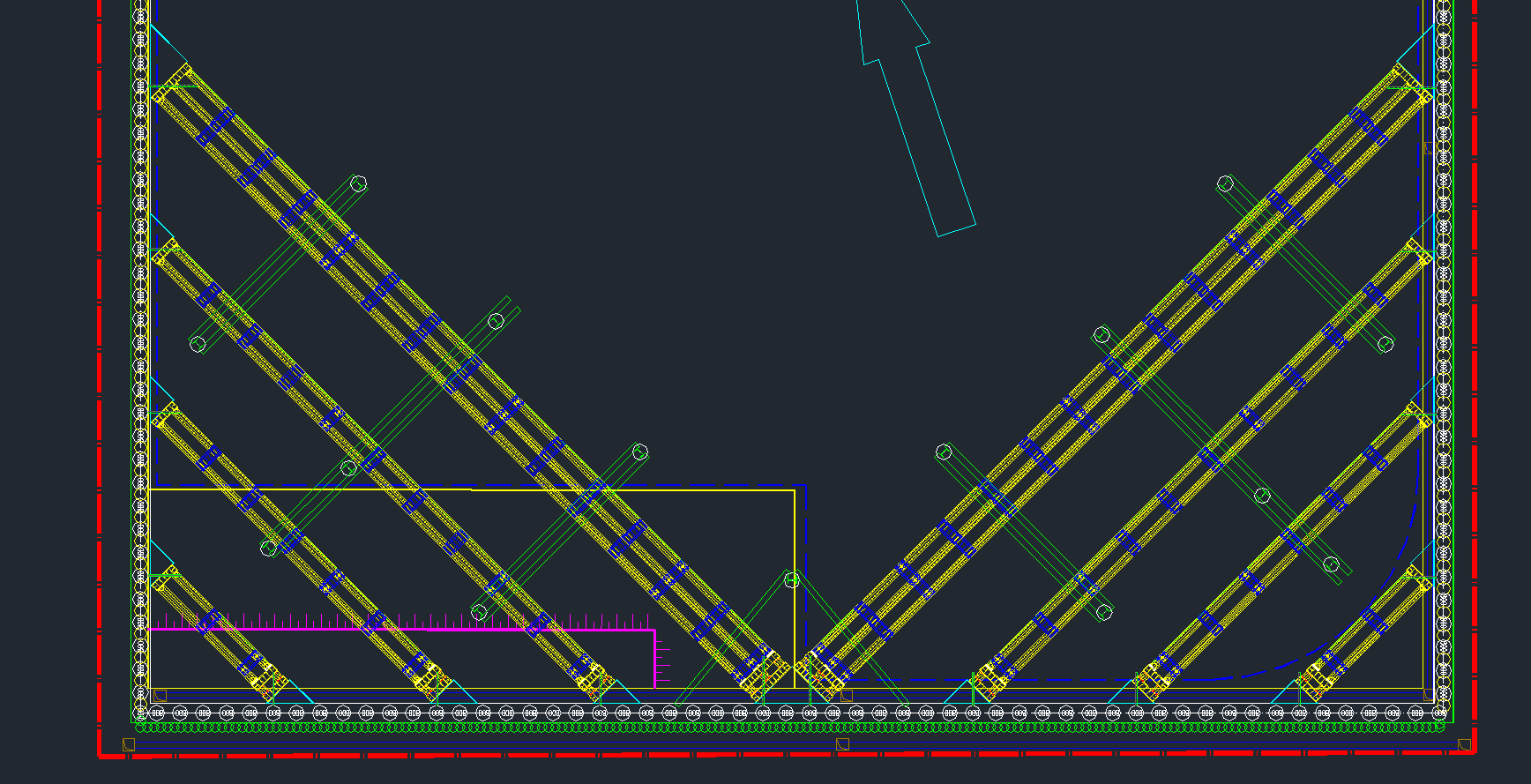 基坑南北兩側采用型鋼角撐,每一側角撐由四道型鋼斜撐組成,與冠梁形成45°角,由內(nèi)向外有雙拼型鋼和三拼型鋼兩種。型鋼采用HHC400ZC,長度根據(jù)標準件長度調(diào)整100A~12000A??缍容^大型鋼支撐設型鋼立柱,采用H488型鋼立柱。